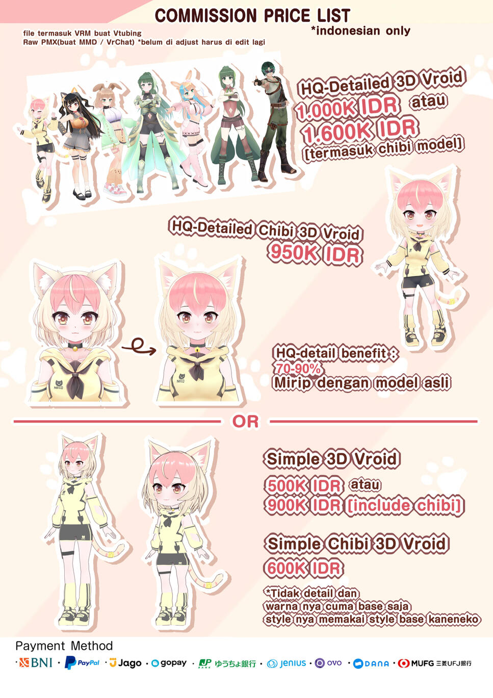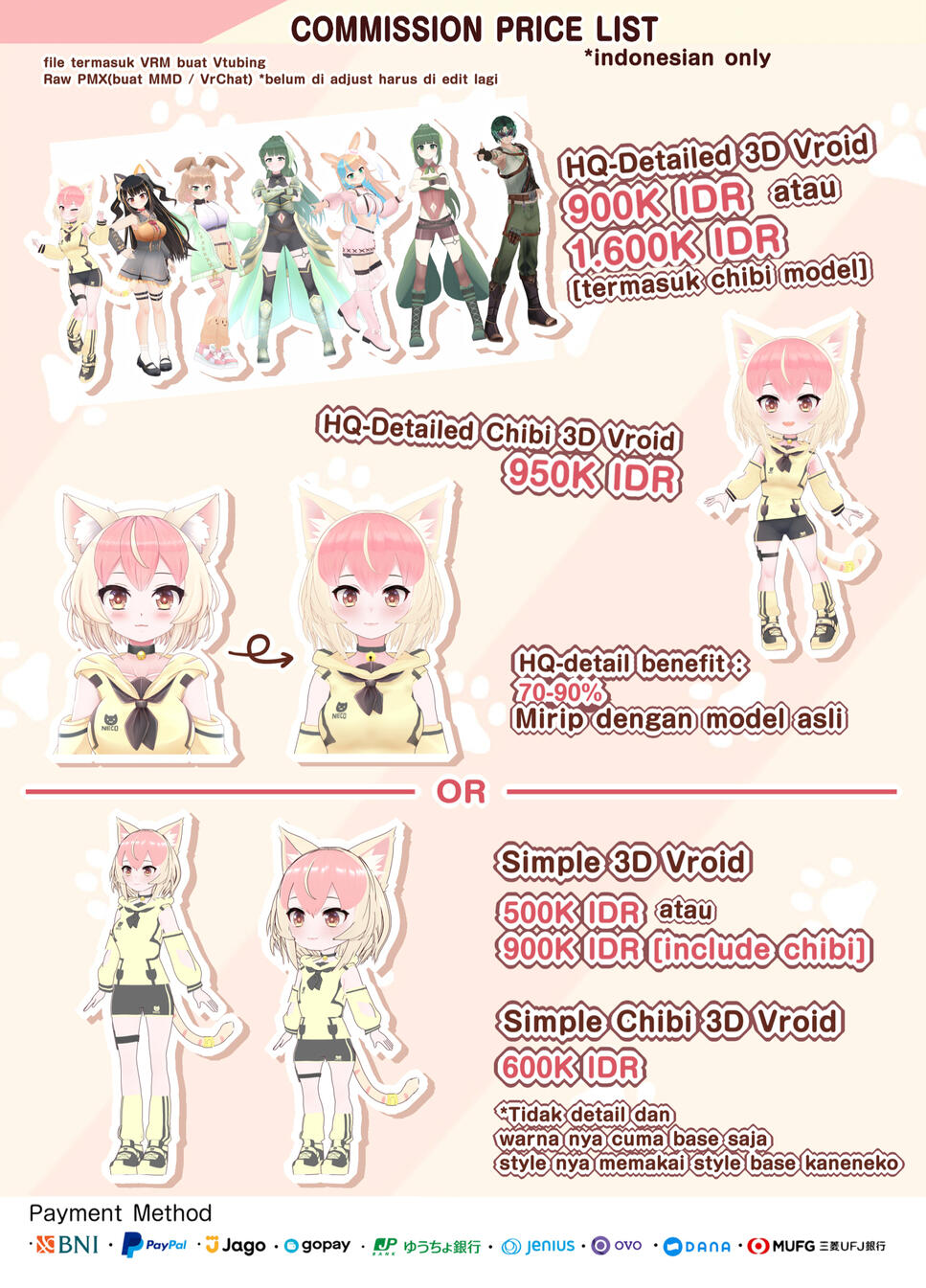 → 完成品は依頼者にお届けTerms Of Service・Working period: usually 3-5 days (depend on queue and deadline)・Additional parts for variations: 500 JPY, 5USD, 50.000 IDR per variations.・For Social Media release, Commercial use / Broadcast use, and other cases: Please just Credit the channel name of the Vtuber "Kaneko Mineko" or the URL of the illustrator "KaneNeko" as much as possible.・For major revisions after the 3D is completed: An additional fee of half the original price of the illustration will be charged. After payment, you can proceed with the revisions.・Work Flow :